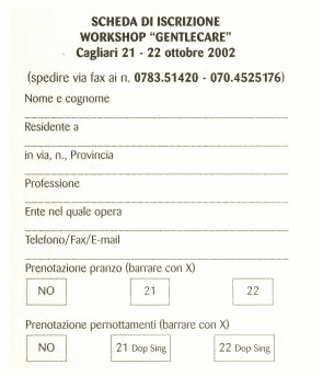Su prenotazione è possibile pranzare presso il ristorante dell'Hotel al prezzo concordato di € 20 / persona. Su prenotazione è possibile pernottare presso l'Hotel al prezzo giornaliero di € 88,00 in camera singola, di € 103,00 in camera doppia uso singola e € 124,00 in camera doppia, con prima colazione a buffet. I posti a disposizione, a pagamento, sono 80. Le iscrizioni si concluderanno al raggiungimento degli 80 accreditamenti, considerati tali al versamento della quota dovuta. Per la priorità si terrà conto della data di effettivo versamento dell'importo alla segreteria o attraverso apposito bonifico bancario. Per il versamento il Conto Corrente di CONSULTER s.a.s. è il n. 603/8 del Banco di Sardegna, Agenzia di Milis, ABI 1015, CAB 87860. Organizzazione: CONSULTER s.a.s. Consulenze per il Terzo Settore Segreteria: via Brotzu, 6 - Milis (OR) Responsabile organizzazione: Rita Fanari Tel. 0783.51239 Cell. 348.3398262 (OR) Segreteria workshop: Paola Pagliazzo Tel. 0783.51239 Cell. 347.9131180